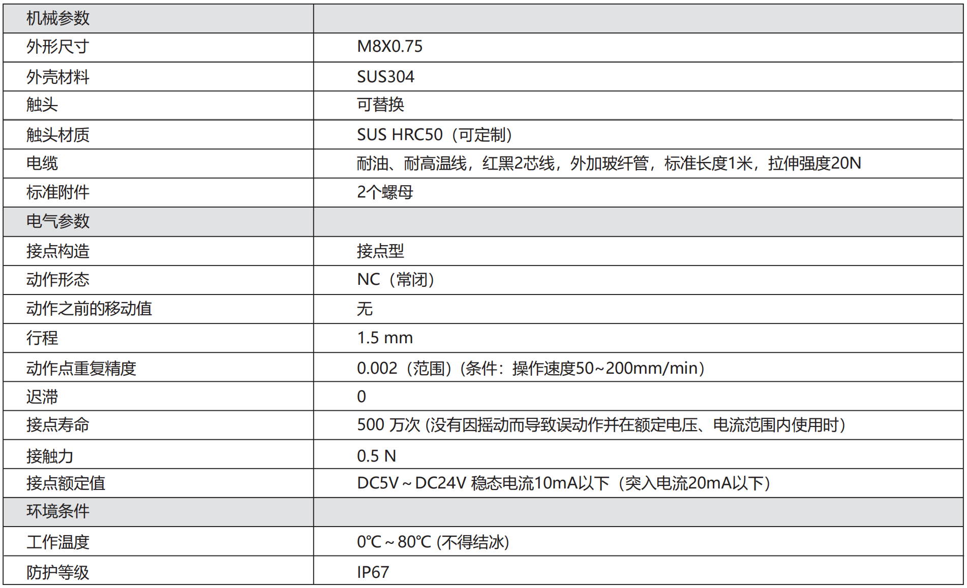 EPSM8B-3.5系列高精度接觸式傳感器,高精度,結構小巧,節省安裝空間。適用于數控車床刀損檢測,屬于超小型對刀儀。內置密封設計,防護等級 IP67 ,防油防水,可以在惡劣環境下使用。不會因電源電壓、自發熱 而導致信號點漂移,可進行小位移連續檢測不會遲滯, 可根據客戶需求定制非標觸頭。
